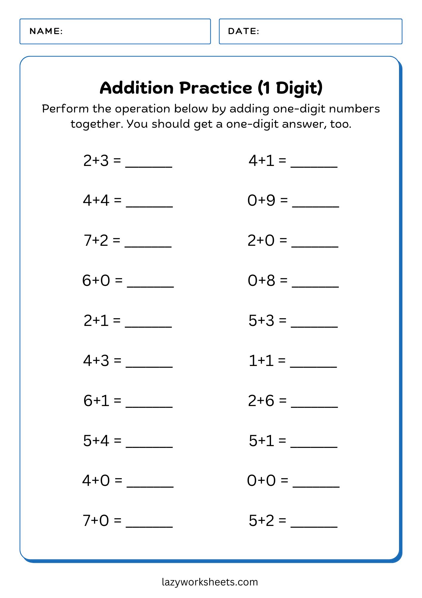 Perfect for young primary schoolers, these worksheets are easy to print and answer. Prepared by educational experts, our simple math worksheets are intended for young learners, homeschoolers, and even students in traditional schools who need an extra “push” to master addition of one-digit numbers.